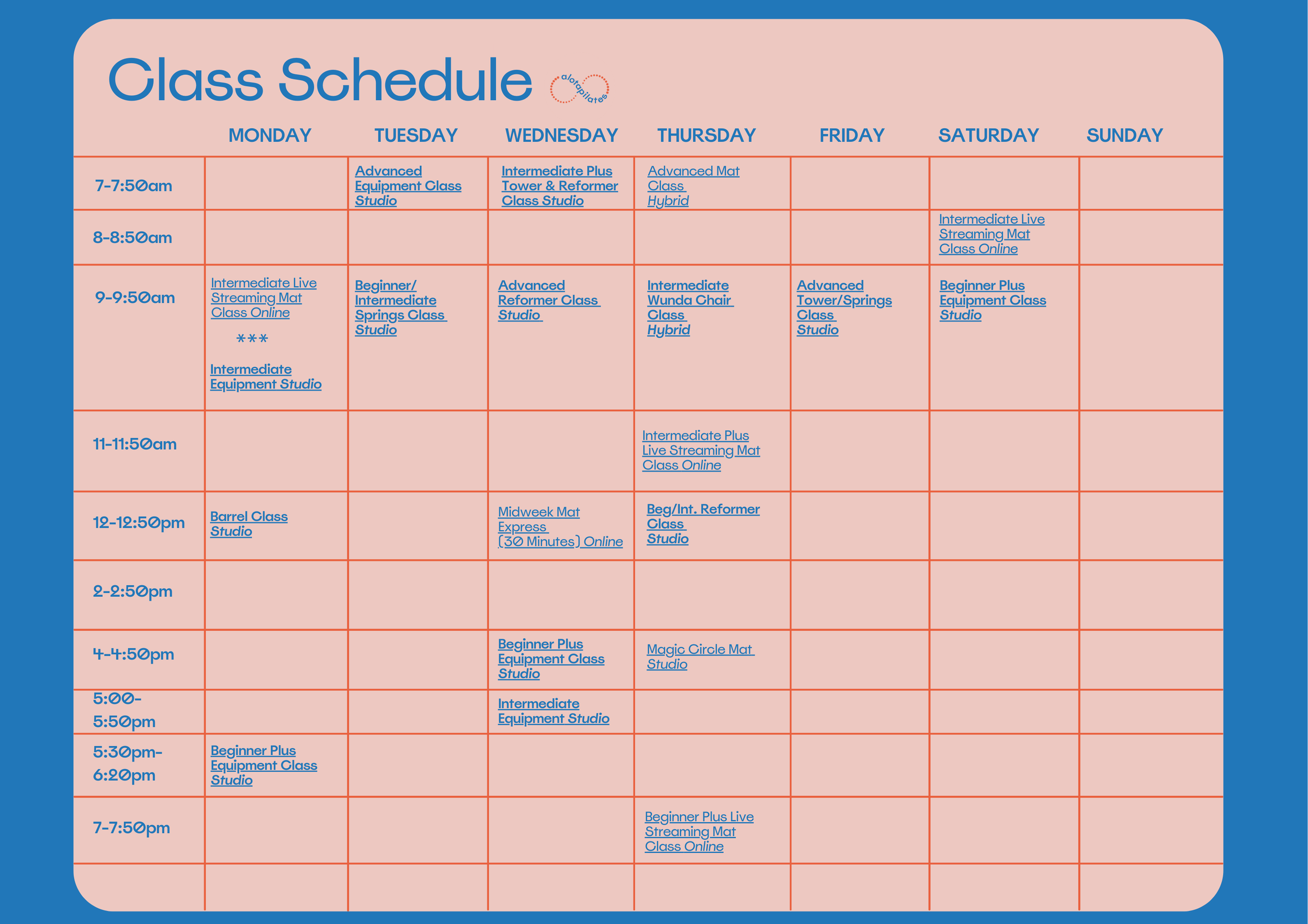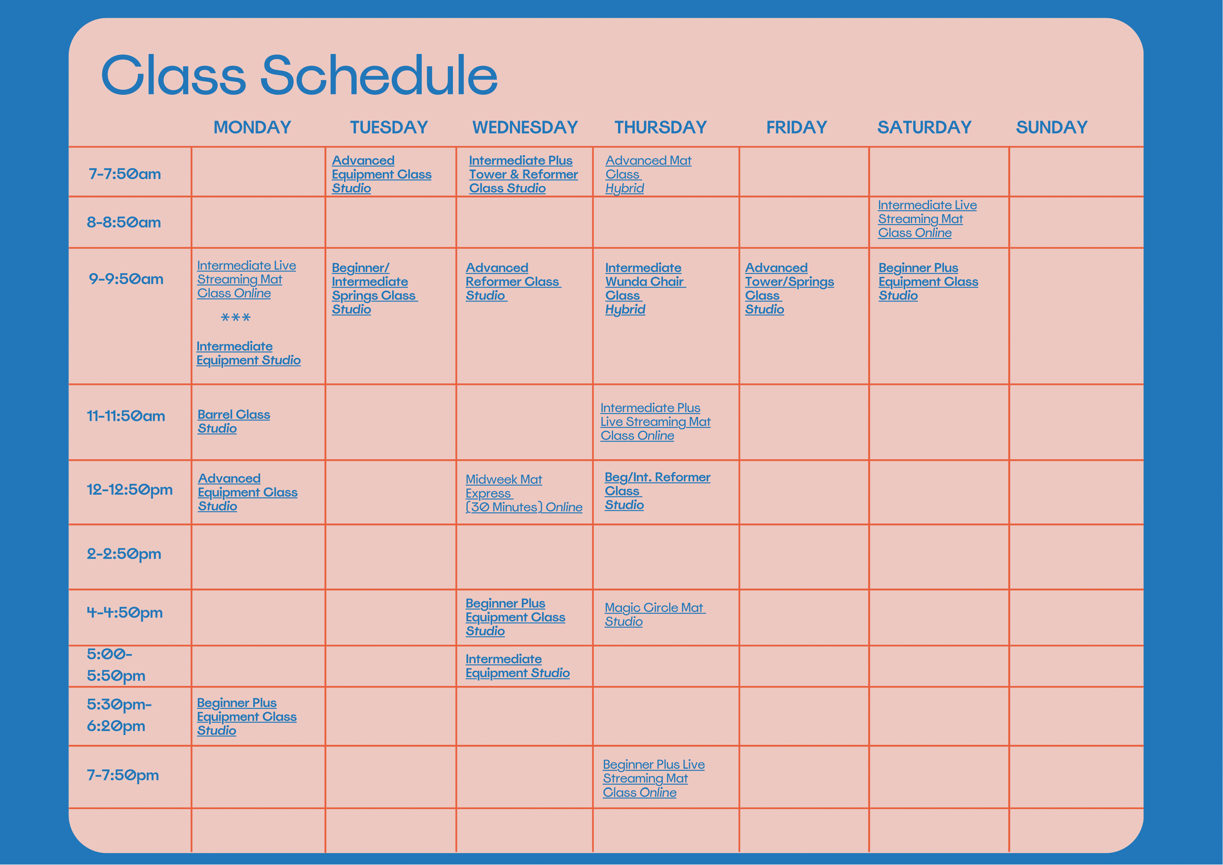 All of our Pilates mat classes are inspired by the classical mat order and tailored to the students attending. If you sign up for a live streaming class we will send you the link to join virtually.